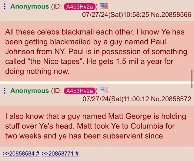 "... Paul Johnson, a former gallery owner and longtime advisor to Ye, had charged him $6 million in 2021 for a Damien Hirst sculpture that could not have been worth even $2 million... proceeded to claim millions of dollars a year from Ye in the years after, allegedly to oversee his archive. In fact, under Johnson, the archive was being plundered. Irreplaceable artifacts are now gone... Grammys, personal effects from the births of his children, and even his mother’s death certificate" Johnson had asked for and received his entire 2024 salary in advance a few weeks before I took over... he lied to me, claiming that it had been 'Ye’s idea' to pay him a year’s salary in advance, and because Yeezy was presented with a bill for nearly a million dollars in bogus storage fees. Johnson has not returned the money, nor to my knowledge..." -Milo